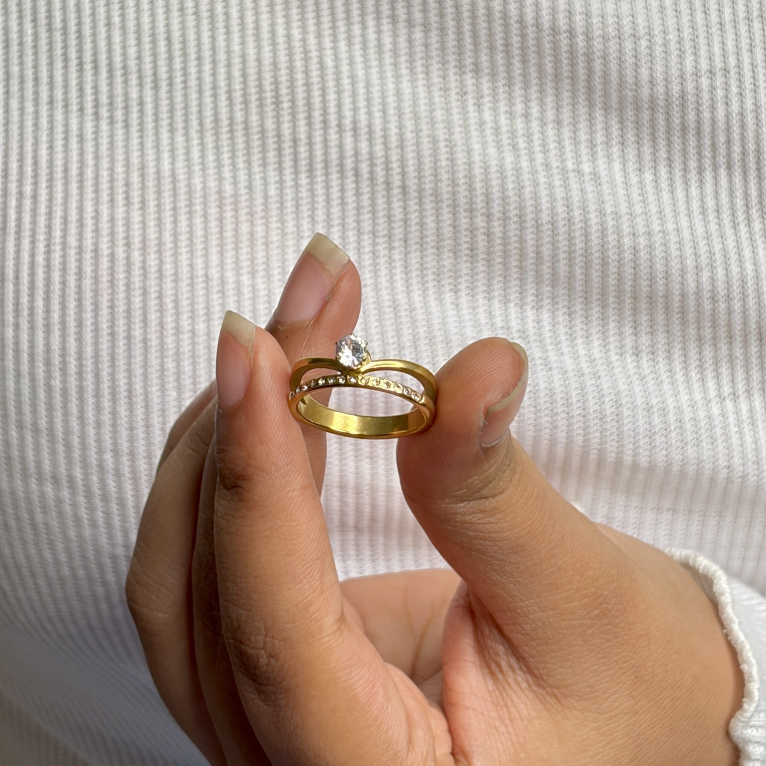 This 18k gold-plated ring features a 312 stainless steel base that is waterproof and anti-tarnish.It is 100% hypoallergenic and safe for sensitive skin.